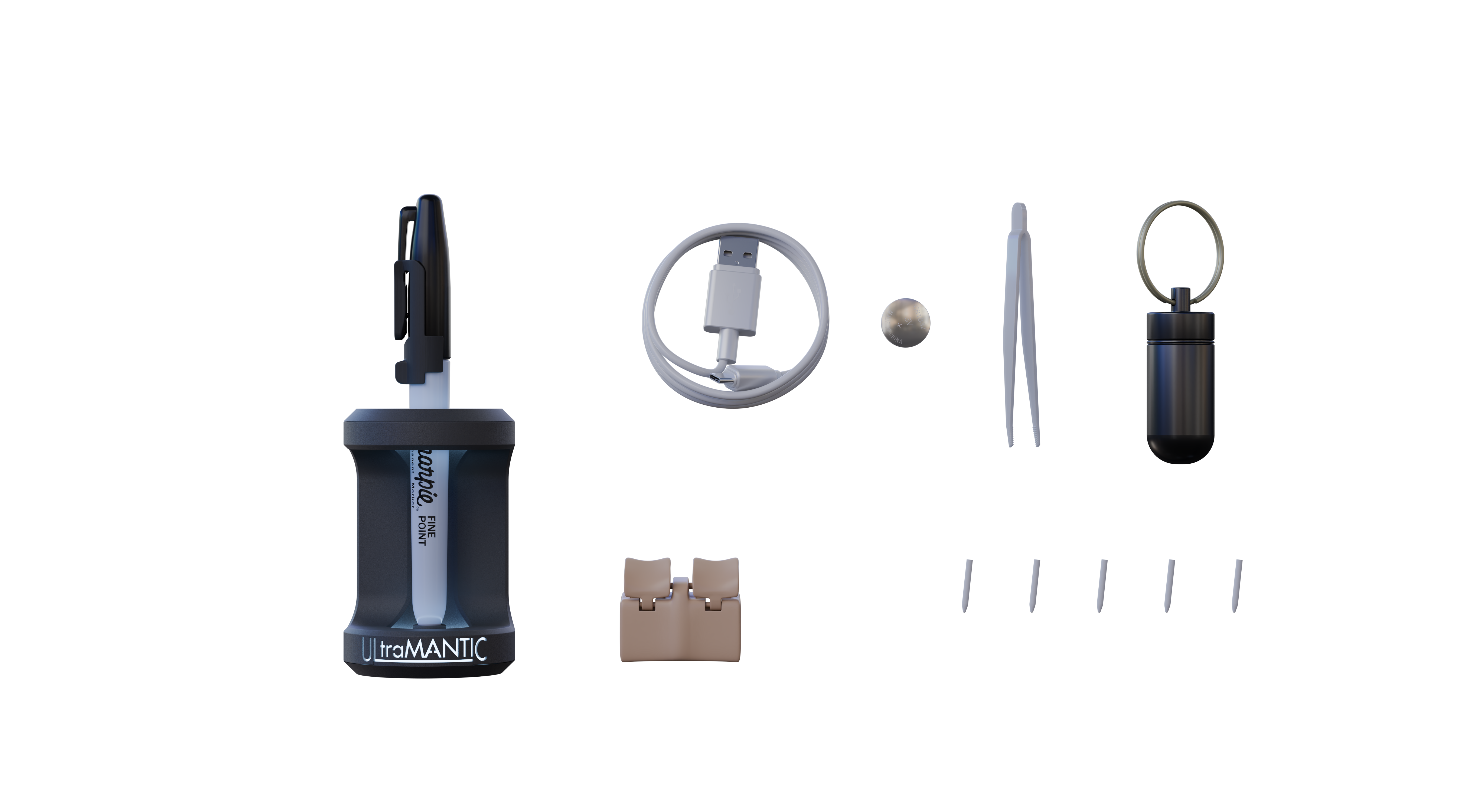 5. Charging cable and accessories pack (button battery *1, aluminum alloy portable mini bottle *1, tweezers *1, pen tips *5)